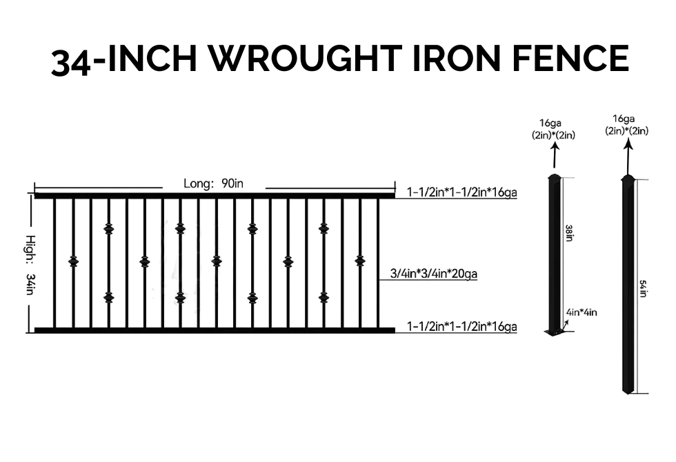 • Wrought Iron Fence Panels: 8 ft wide, with heights from 3 ft to 8 ft.